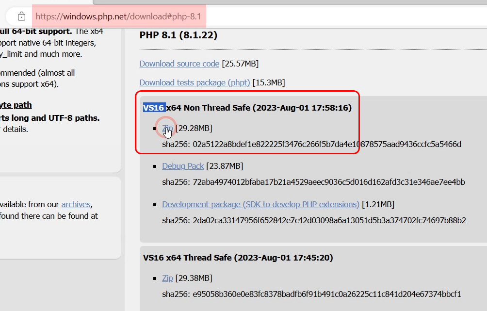 php도 새로운 버전으로 다운받아야 하는데, 잘보면 윈도우용 php는 VS16에 대한 의존성을 표시하고 있다.