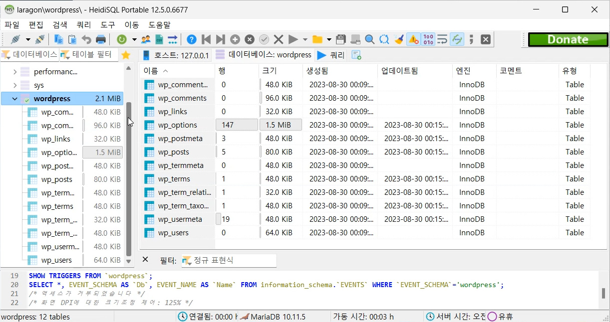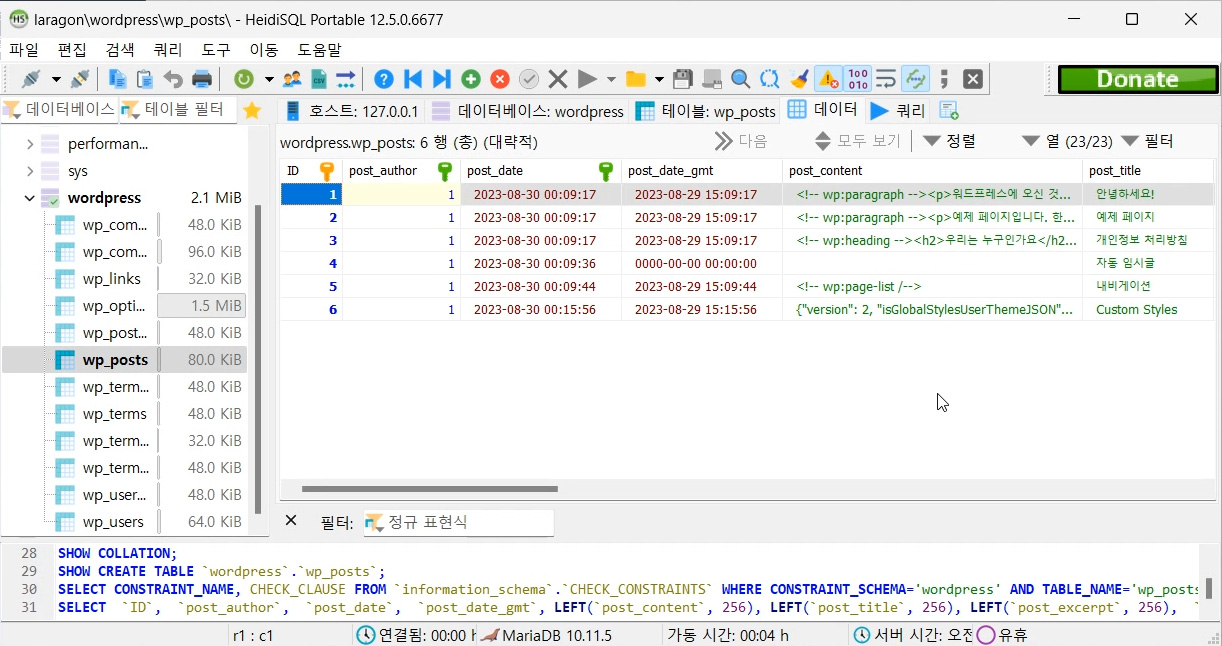 wordpress 아래에 각종 테이블이 생성되어 있다.