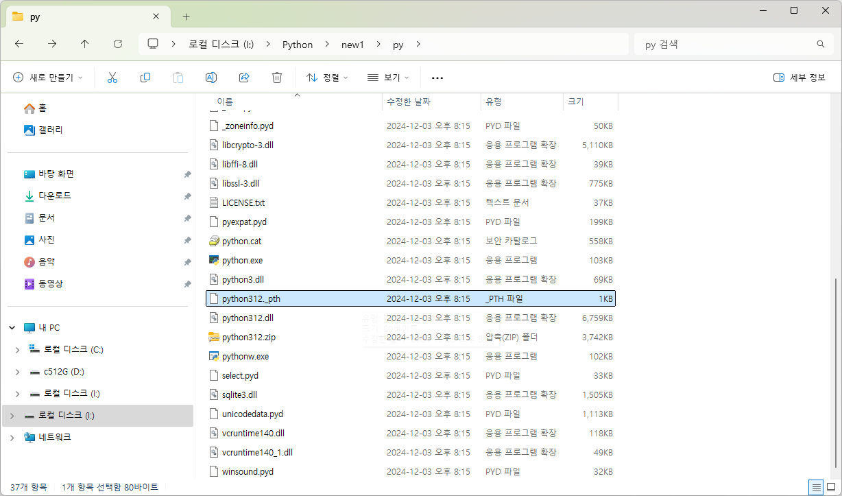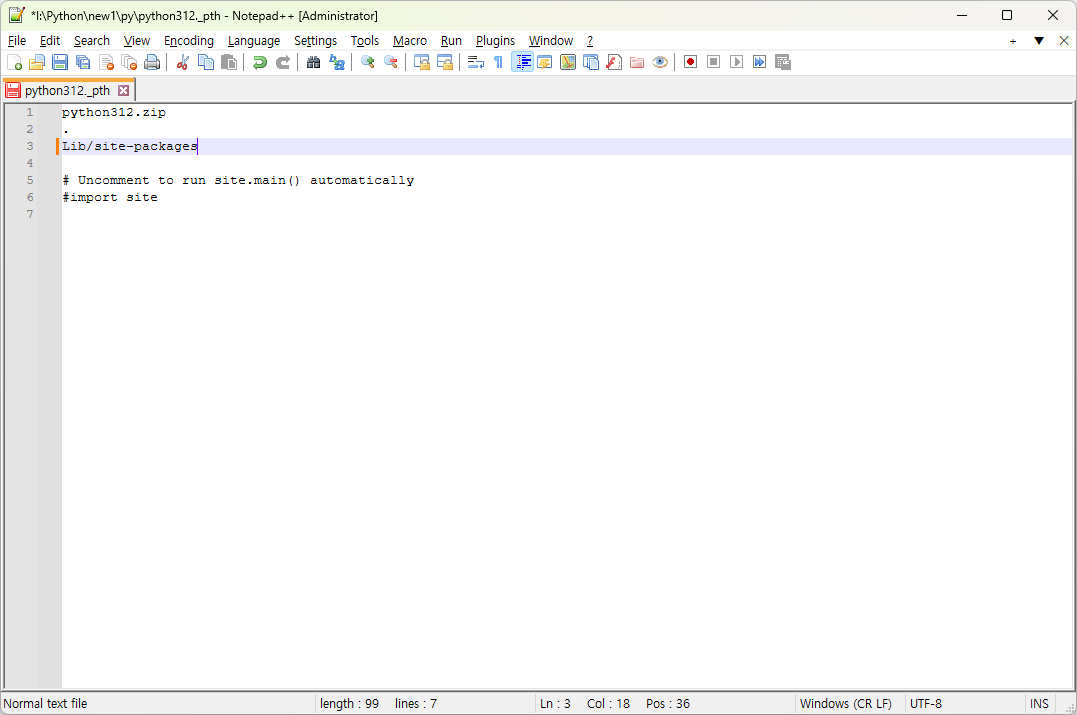 파이썬 엠베디드 폴더에서 python312_.pth 파일을 텍스트편집기로 수정해야 한다.