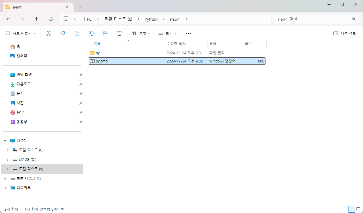 마우스 오른쪽 버튼으로 새로 만들기(W) > 텍스트문서 로 빈 파일을 하나 만들고 파일명과 확장자를 py.cmd 등으로 변경한다.