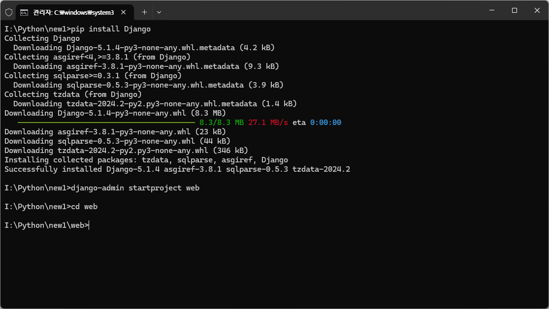 커맨드창에서 Django 프로젝트를 실행시켜주어 제대로 동작되는 것을 확인할 수 있다.